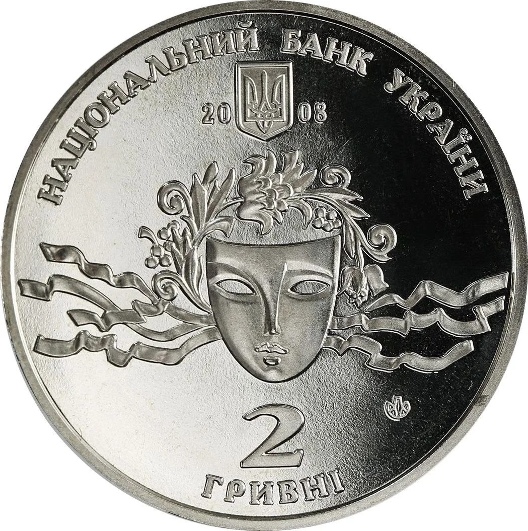 The obverse features a theater mask. Above it, a semicircular inscription reads "Національний банк України" with the Small State Emblem and the year 2008 below. Under the mask are "2 ГРИВНІ" and the Mint's logotype.