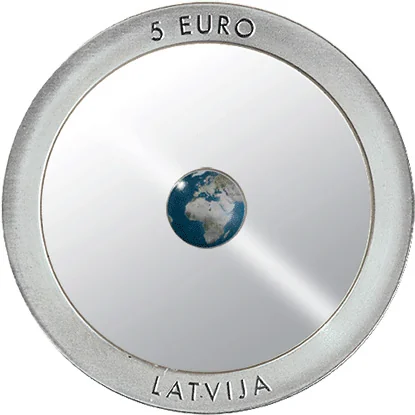 The obverse features a colored geophysical world map at its center, surrounded by a perlucor ring and a silver outer ring inscribed with "5 EURO" and "LATVIJA."