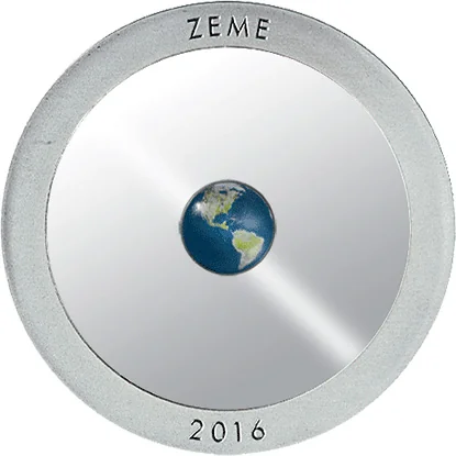 The reverse features a colored geophysical world map at its center, surrounded by a perlucor ring and a silver outer ring inscribed with "ZEME" and "2016".