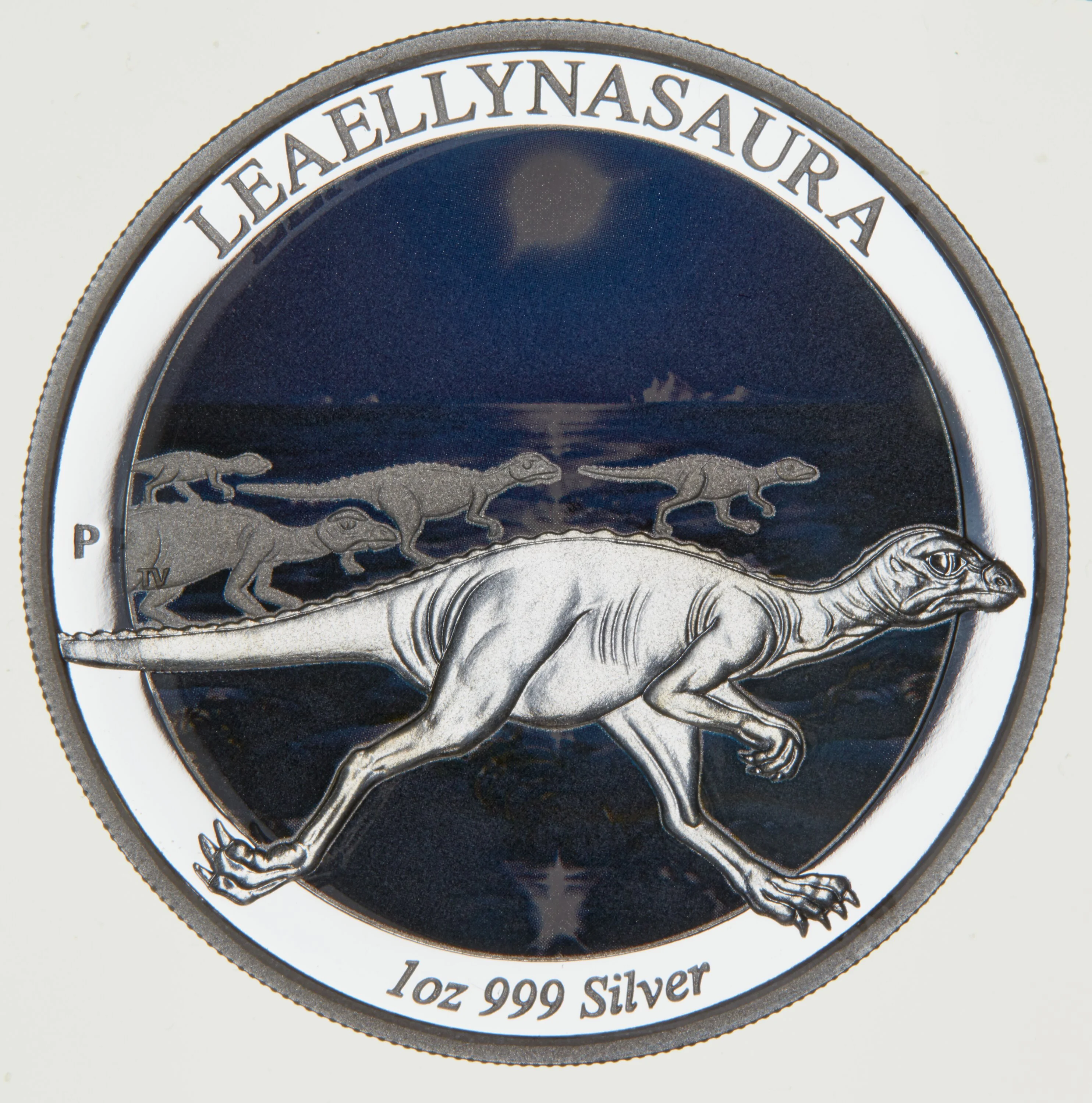 Leaellynasaura amicagraphica in a prehistoric night scene. Includes "P" mint mark and designer's initials "TV".