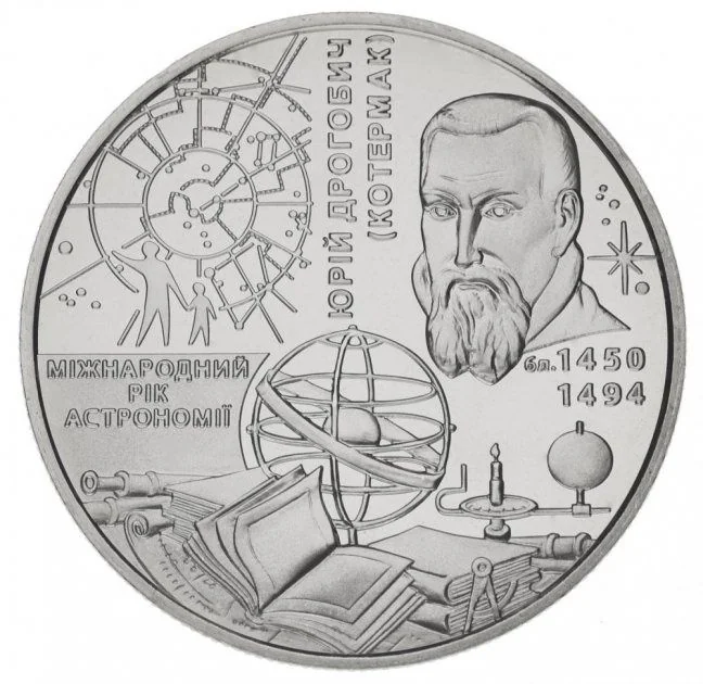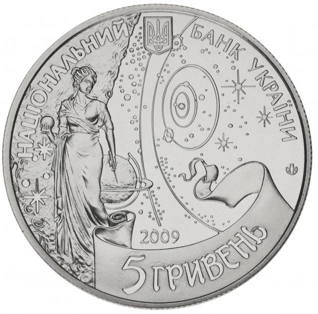 Description: Depicted: Ukraine's Small Coat of Arms and the inscription "НАЦІОНАЛЬНИЙ БАНК УКРАЇНИ" above. Below is a cosmic composition featuring Urania, patroness of astronomy, alongside a depiction of space and a planetary motion diagram. At the bottom are the year 2009, the Mint's logotype, and the face value "5 ГРИВЕНЬ" on a stylized scroll.