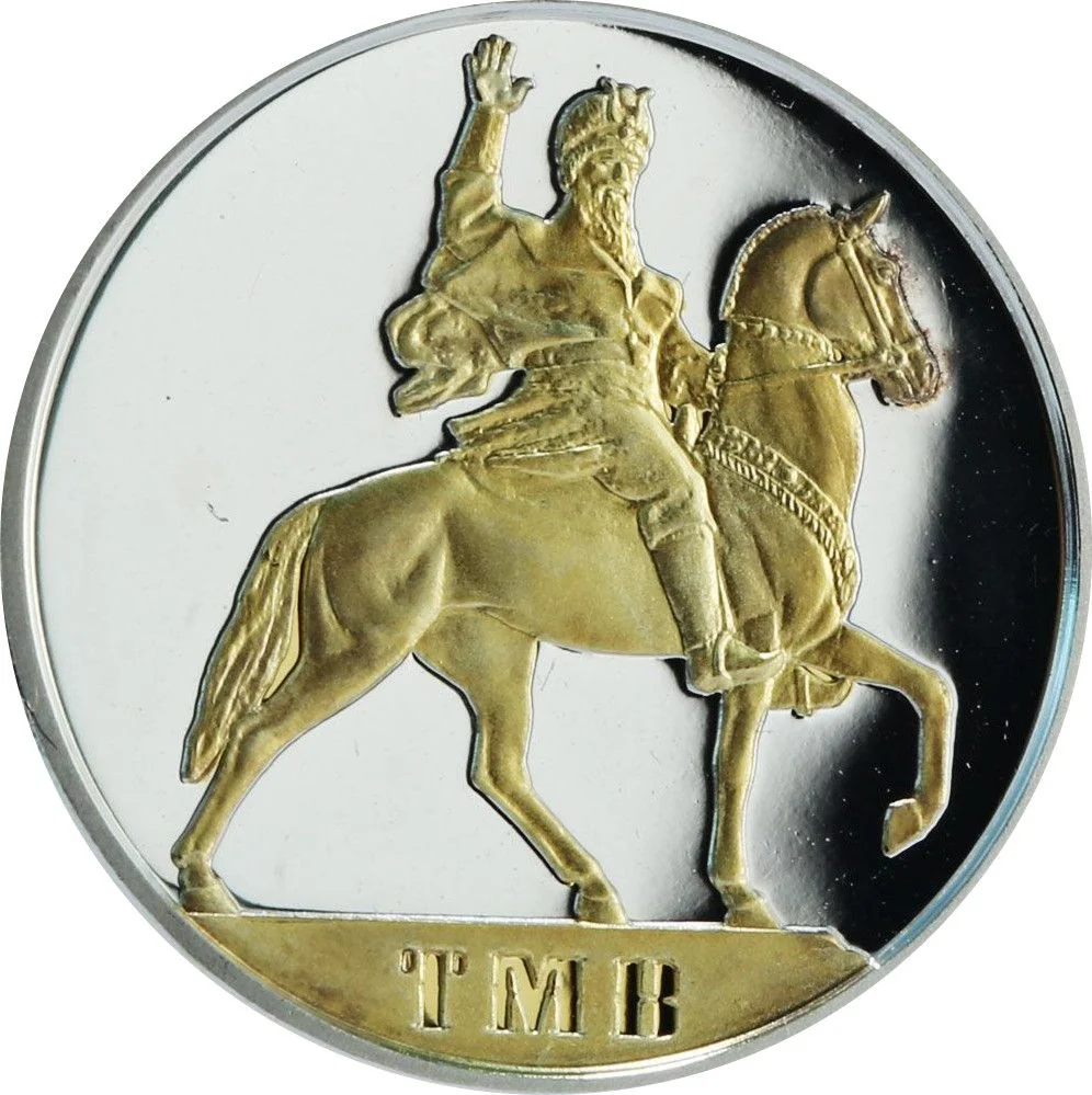 Gilded equestrian statue of Oguz Khan, with the issuing bank abbreviation TMB.