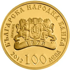 Description: The obverse shows the BNB logo, the year '1879' on a strip, the denomination '100 ЛЕВА', and the issue year '2012'. The circumference is inscribed with 'БЪЛГАРСКА НАРОДНА БАНКА'.