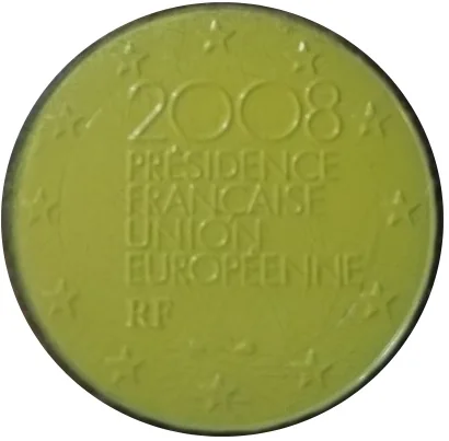 The coin bears the inscription ‘2008 PRÉSIDENCE FRANÇAISE UNION EUROPÉENNE RF’. The mint and mintmaster's marks are below, flanking the design, with the EU's twelve stars on the outer ring.