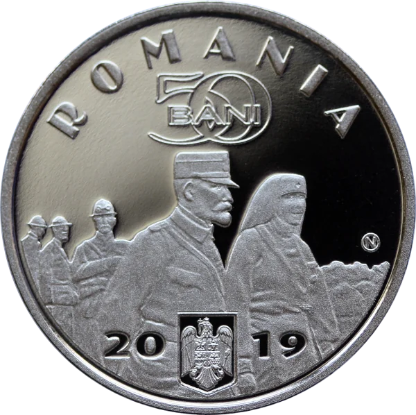 King Ferdinand I and Queen Maria visiting troops; "ROMANIA" arched above, with "50 BANI," Romania's coat of arms, and "2019."