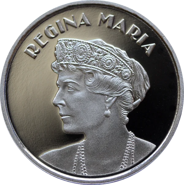 Portrait of Queen Maria with "REGINA MARIA" arched above.