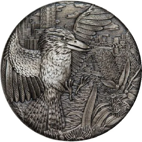 The reverse shows a kookaburra flying over Kings Park with the Perth skyline, and includes the Perth Mint's 'P' mintmark.