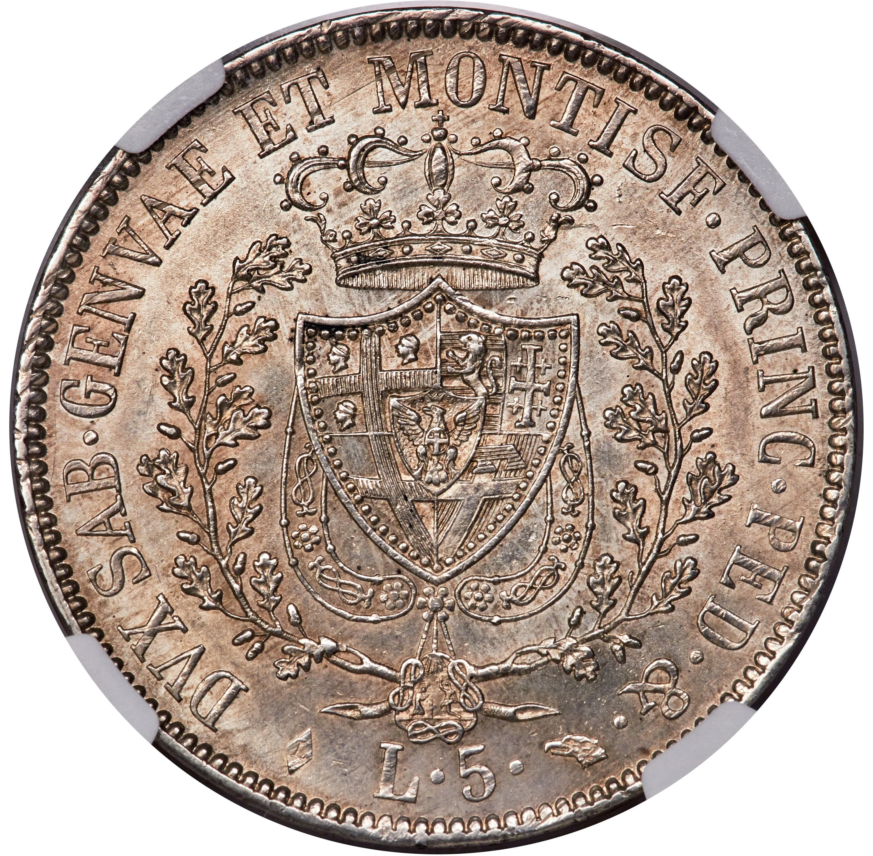 Shield with four sections and central Savoy eagle, between oak branches; collar order below; "L.5." and mintmarks at bottom.