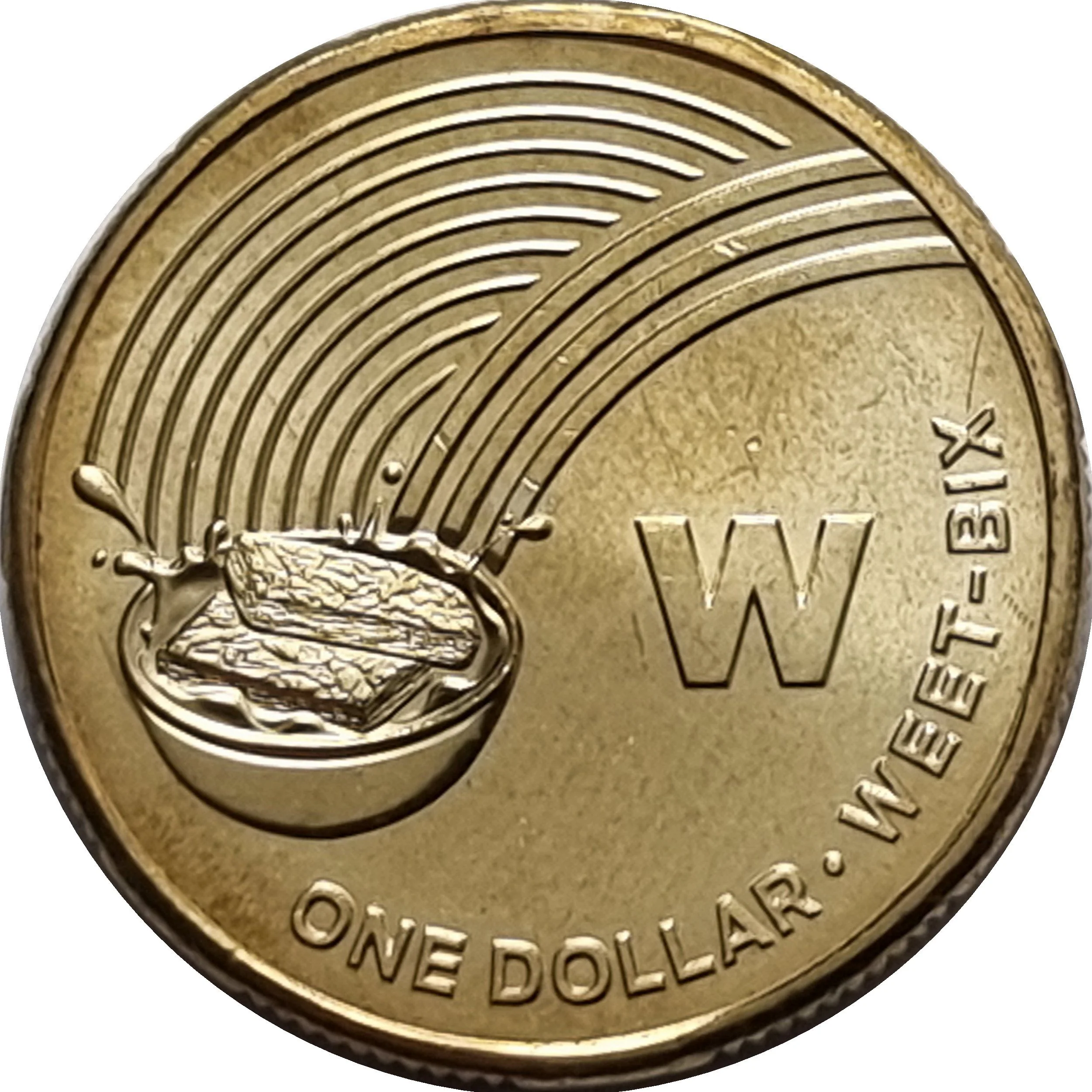 Two Weet-Bix splash into milk. Letter W on the right.