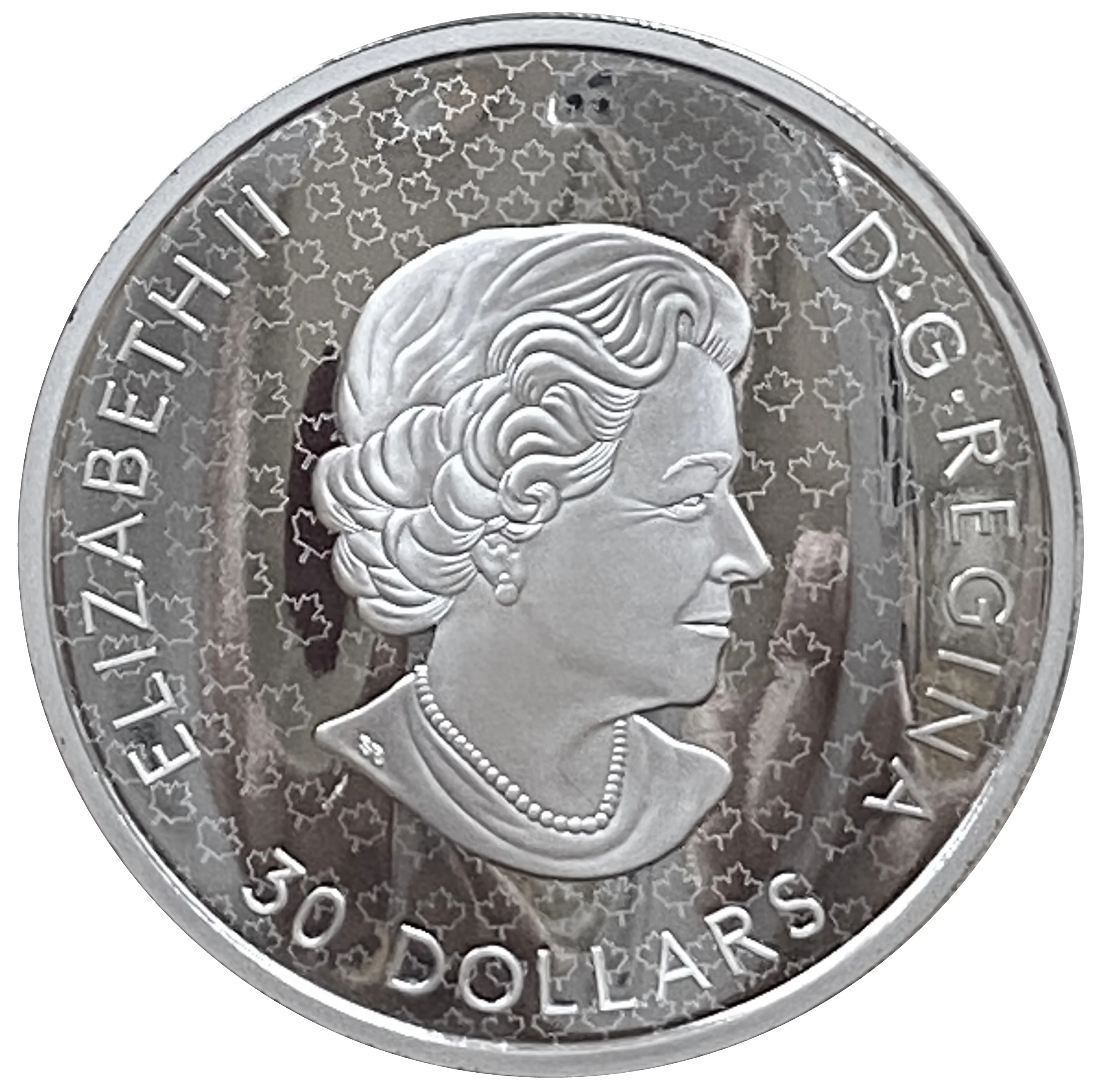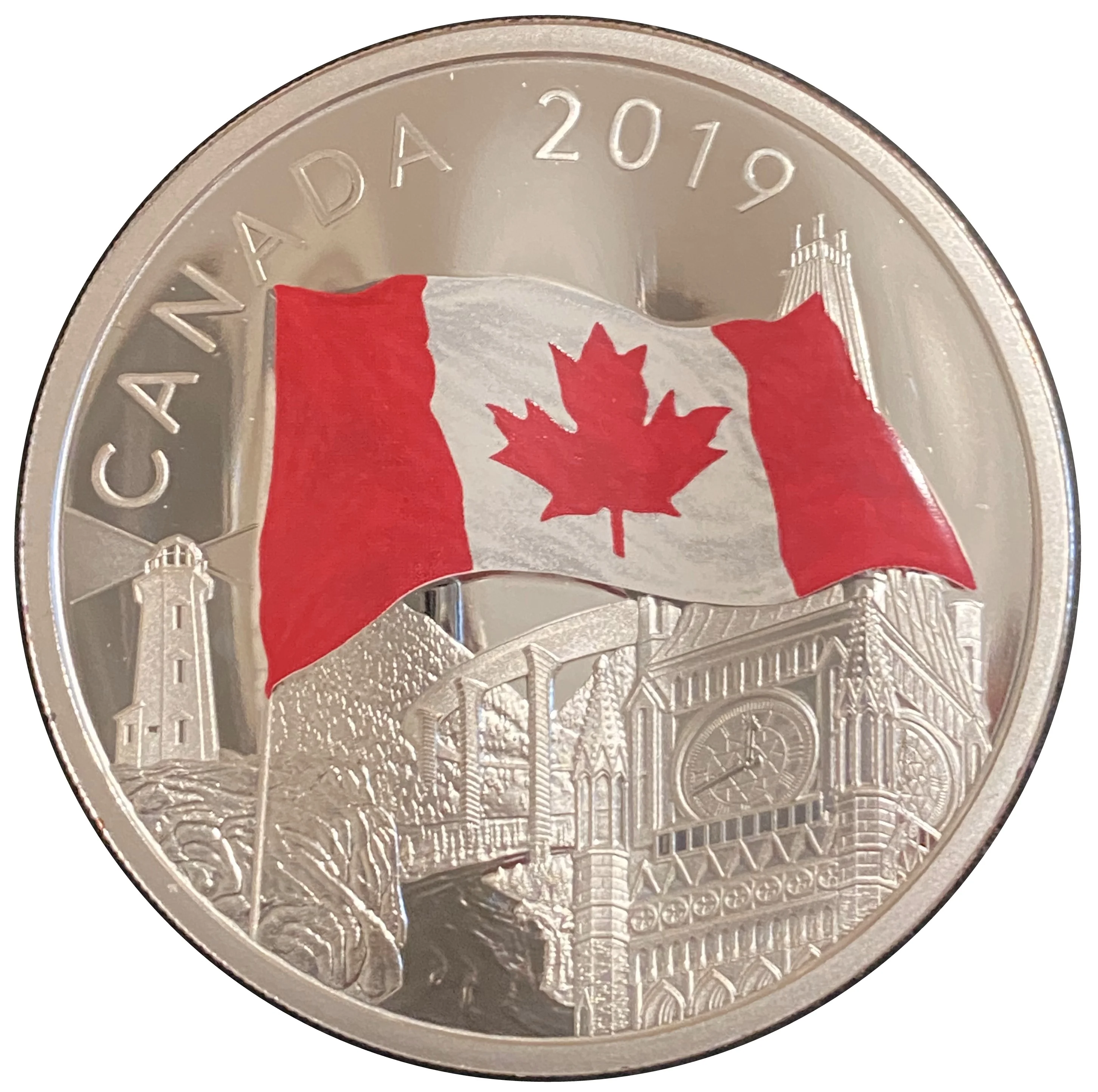 Rebecca Yanovskaya's reverse design is struck on an undulated coin, giving movement to the waving flag. It features Peggy’s Point Lighthouse, the Peace Tower’s pinnacle, and a detailed Kicking Horse Canyon between them.