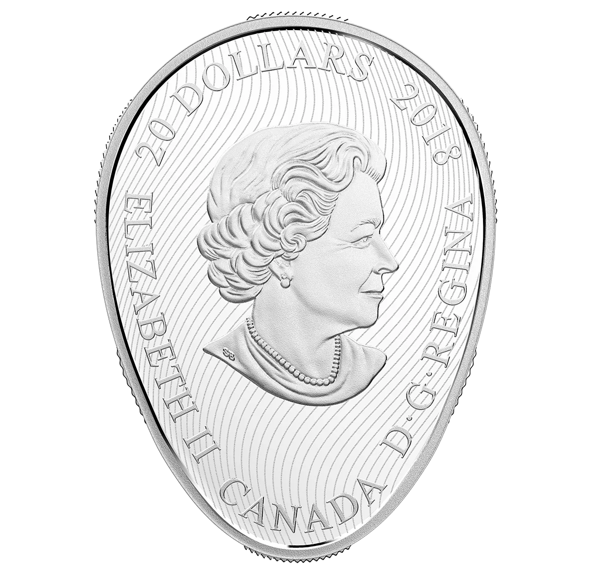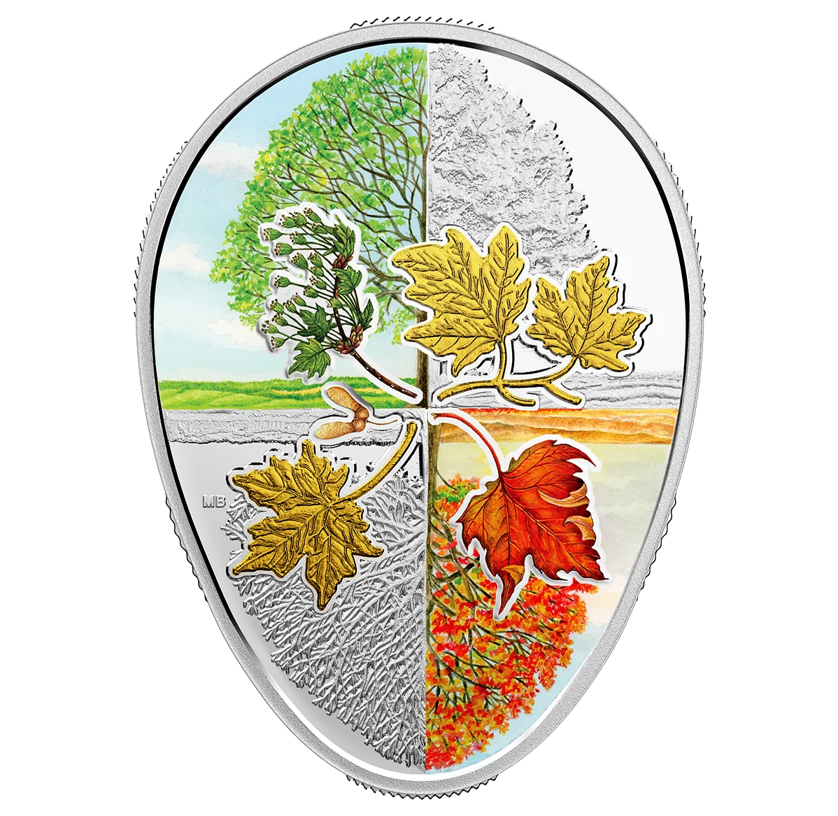 This coin by Margaret Best captures a sugar maple through the seasons. An engraved maple tree and its mirror image are split into quadrants for spring, summer, fall, and winter. The coloured spring quadrant shows reddish buds, while selective gold plating on the summer quadrant mimics sunlight. The fall quadrant is a tapestry of red, yellow, and orange, and the engraved winter quadrant features a frosted silhouette. The egg-shaped coin, symbolizing renewal, includes maple keys to represent the tree's future and the timeless seasonal cycle.