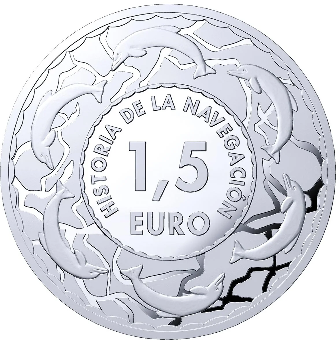 Central circle with face value and series, encircled by six dolphins leaping over aquatic motifs.