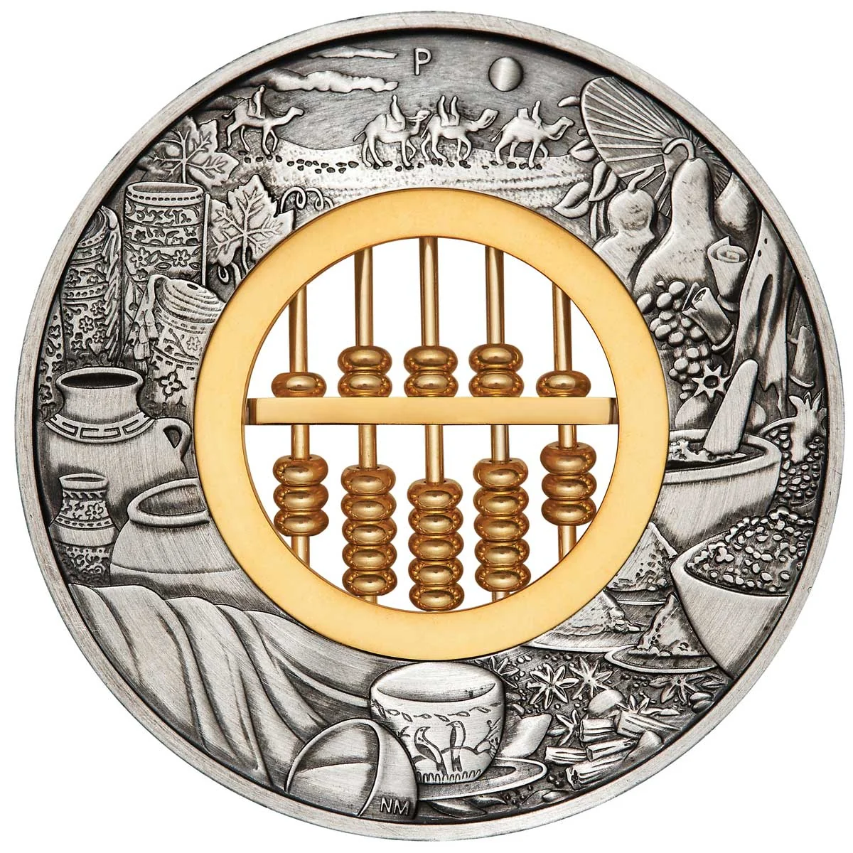 An abacus inset with Silk Road traders on camels, foregrounded by typical goods: pottery, textiles, fruit, paper, fragrances, and spices.