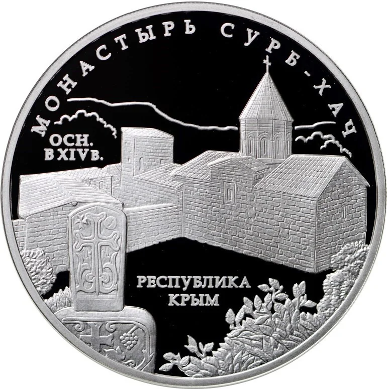 Surb-Khach Monastery relief. Inscriptions: "МОНАСТЫРЬ СУРБ-ХАЧ" around the top, "ОСН. В XIV в." on the left, and "РЕСПУБЛИКА КРЫМ" at the bottom.