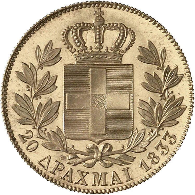 Recognizing this crisis, the newly installed monarchy of King Otto, under the guidance of the Great Powers (Britain, France, and Russia), moved swiftly to establish a modern national currency. The drachma was introduced by royal decree in 1833, directly modeled on the French franc to align Greece with the Latin Monetary Union system. It was a bimetallic system, with silver drachma coins as the primary unit and gold 20-drachma coins (the phoenix, named after the mythical bird on the first provisional coinage) for larger transactions.