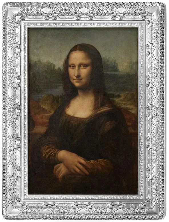 The Mona Lisa is faithfully recreated with its original background, set within a reproduction of its real silver frame.