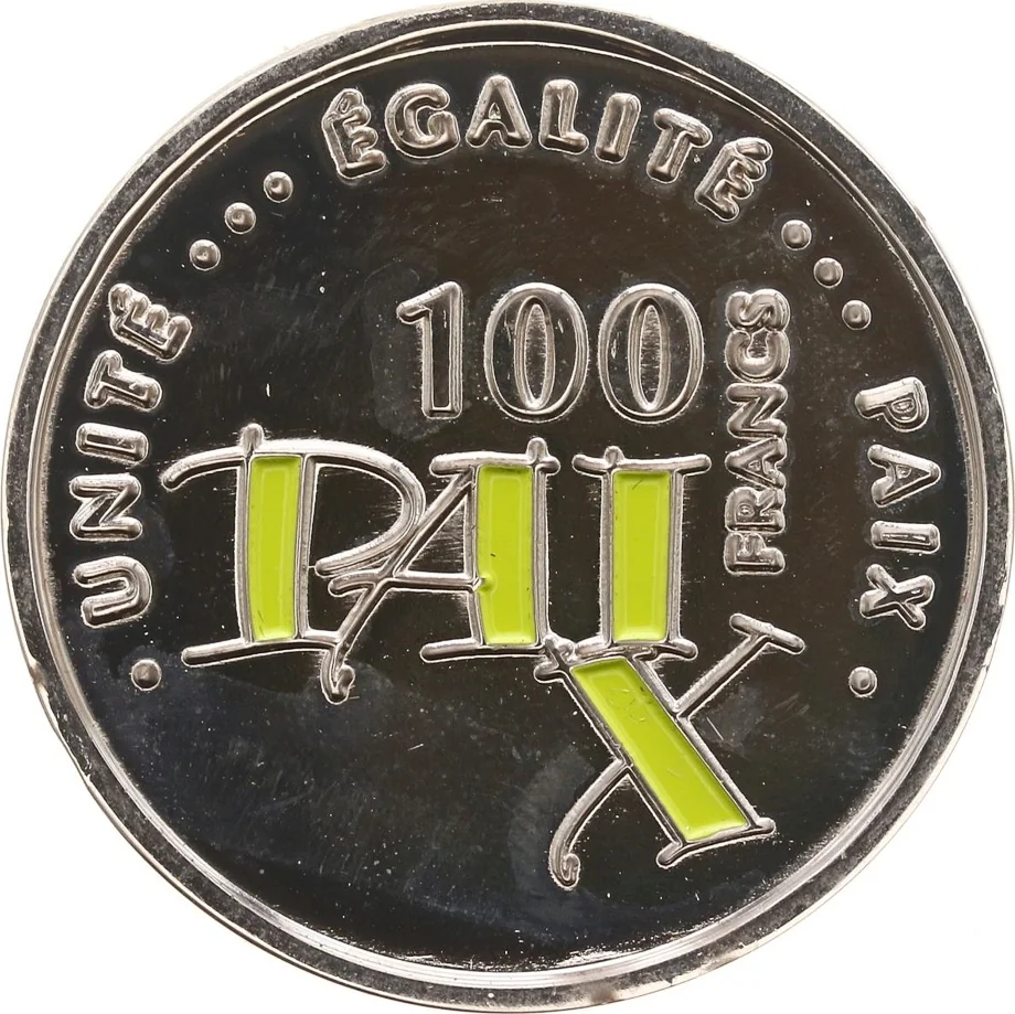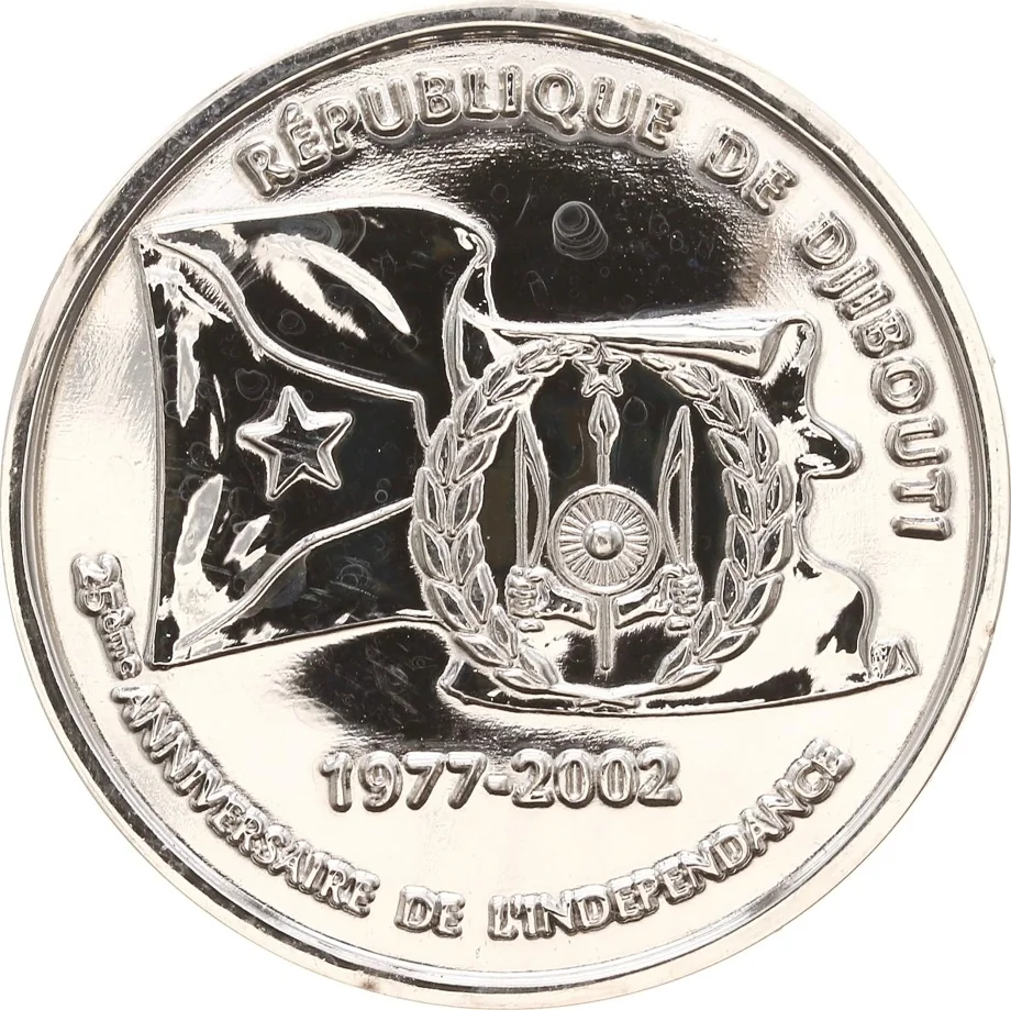 Djibouti's motto "UNITÉ, ÉGALITÉ, PAIX" encircles the rim, with the value and "PAIX" in colour below.