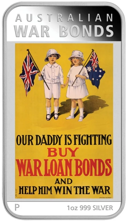 Australian War Bonds coin featuring a colorized "Our Daddy is Fighting" WWI poster, with the Perth Mint 'P' mark, weight, and fineness.