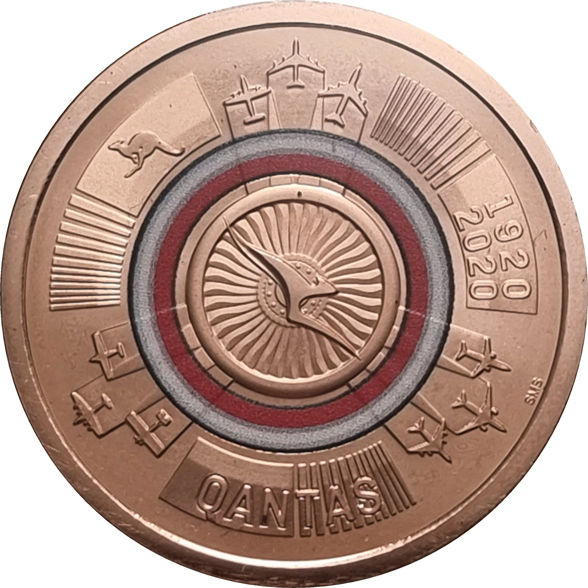 The QANTAS Flying Kangaroo logo is centered over jet engine blades within a red and white ring. Outside, nine QANTAS aircraft fly outward in groups of three. A kangaroo is at top left, "1920 2020" at top right, and "QANTAS" below.