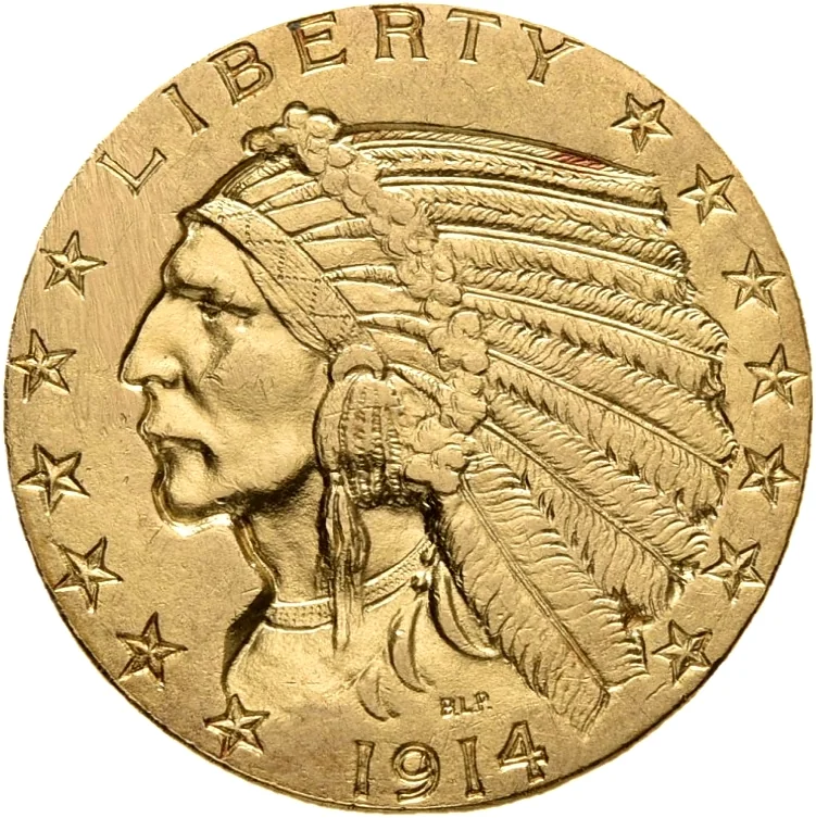 Indian head in war bonnet facing left, incused design, date below, stars around rim.