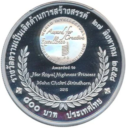 Description: Bust of Princess Maha Chakri Sirindhorn in plainclothes, facing half-left. She wears a commemorative brooch on her left chest, with inscriptions below.