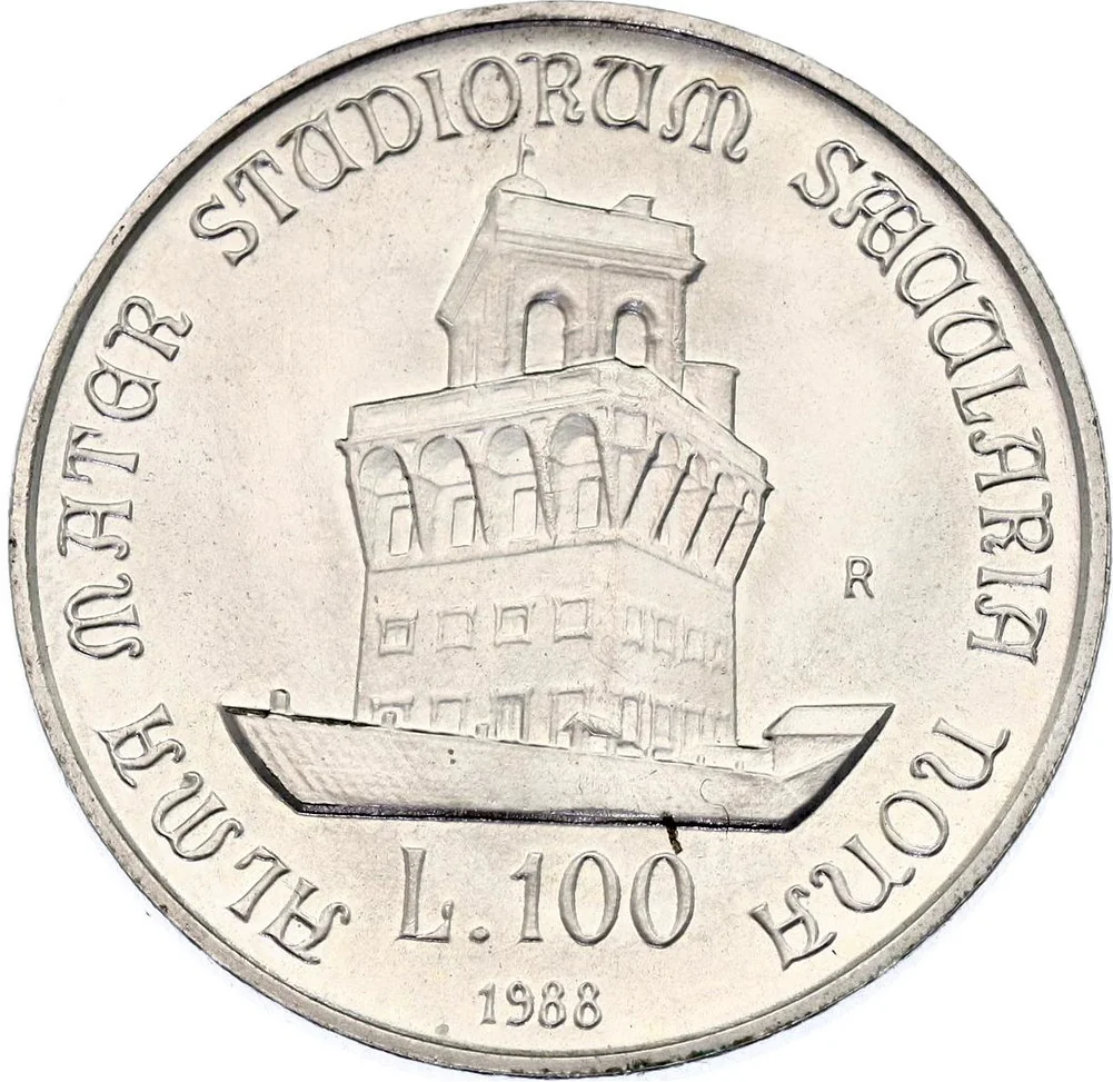 Bologna University Astronomical Observatory Tower ("Specola"). Value and date below. Mintmark right of tower.