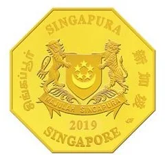 Emblem with date; 'Singapore' encircles it in English, Tamil, Chinese, and Malay.