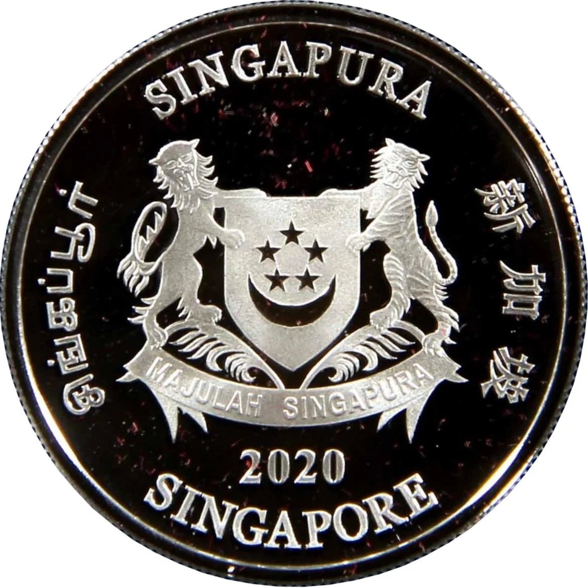 Emblem with date; 'Singapore' encircles it in English, Tamil, Chinese, and Malay.