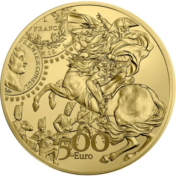 Evokes Napoleon's Consulate and First Empire, featuring the Germinal franc's obverse and reverse alongside symbols of the era: the Legion of Honour, the bee, and the laurel crown.