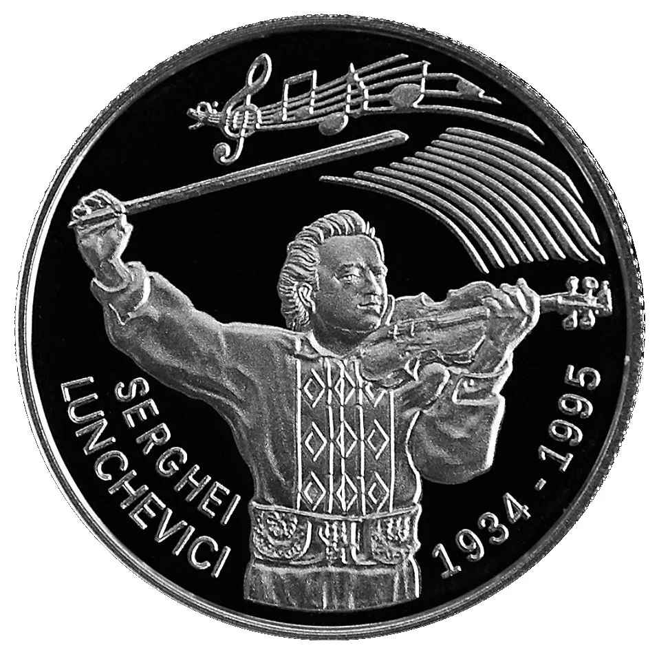 The central half-length figure of Serghei Lunchevici playing the violin, above a musical score. Below left, "SERGHEI LUNCHEVICI" is engraved in bold, with his years "1934-1995" to the right.