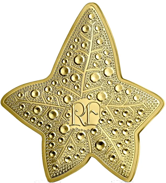 A close-up of an ivy leaf, its ribs adorned with small diamonds. The letters "RF" are at the coin's center.