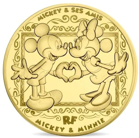 A full-length portrait of Mickey and Minnie Mouse in love, forming a heart with their hands. They appear to pop out from a painted background, within a series titled "Mickey & ses amis."