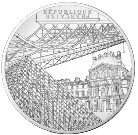 The obverse depicts the Louvre's Pavillon Richelieu, its pediment with caryatids, and I.M. Pei's glass pyramid (highlighted in rhodium on silver coins). "République française" appears when tilted. The Pont des Arts occupies the other half.