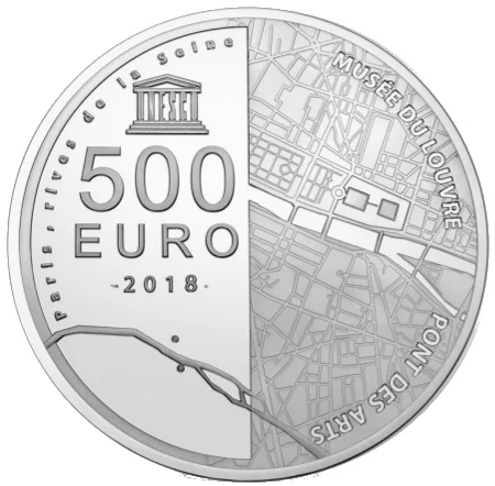 Common to the series, each coin is split: the left shows the UNESCO logo and value, the right an aerial view of the monuments' location, connected by the Seine's path across Paris.