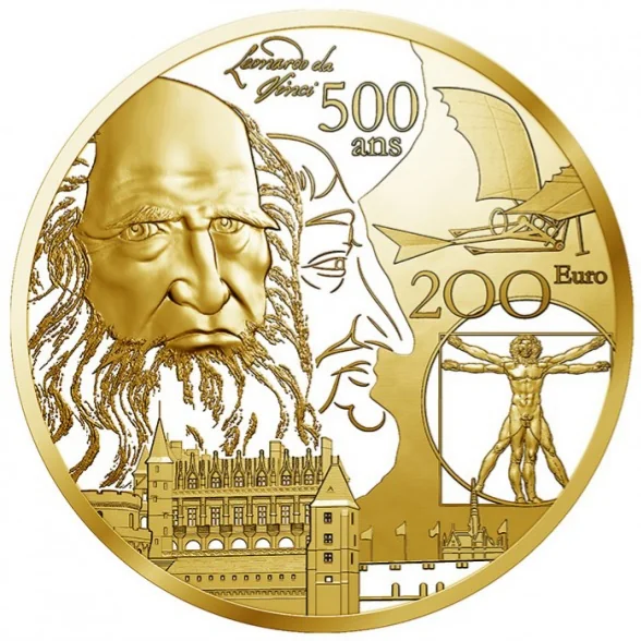 The reverse features Renaissance symbols: François I, Leonardo da Vinci with his Vitruvian Man and flying machine, and the Château d'Amboise, his final resting place.