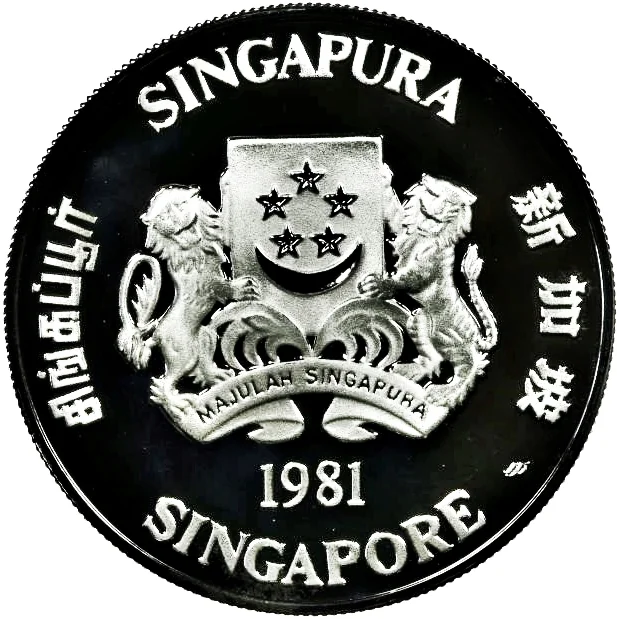 The Singapore Arms, supported and encircled by "SINGAPORE" in four languages, with the year-date beneath.