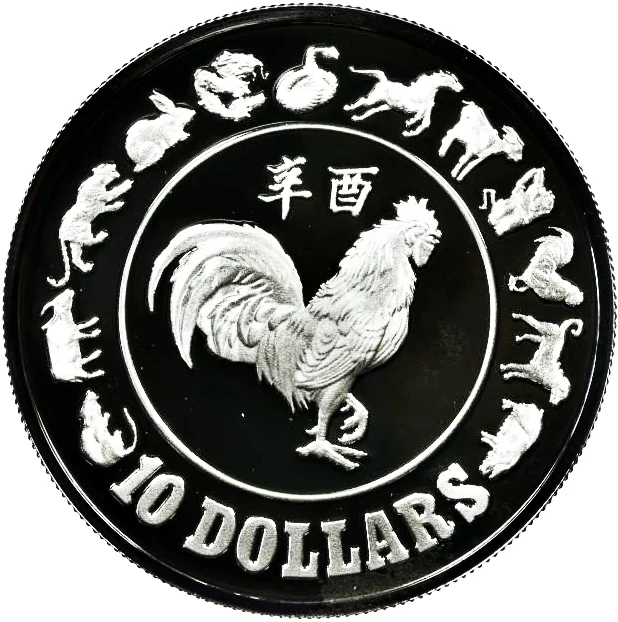 Rooster facing right inside a circle, surrounded by other lunar zodiac animals, with value below.