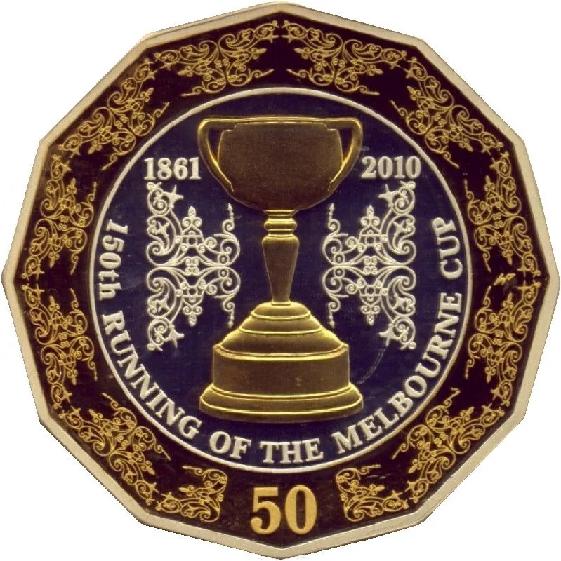 Melbourne Cup image in gilt scrollwork within a circle, surrounded by gold scrolls and the denomination.