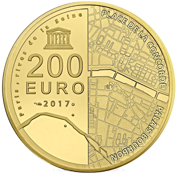 The shared reverse design features the UNESCO logo and face value on the left, and an aerial view of the monuments' location on the right, connected by the path of the Seine through Paris.