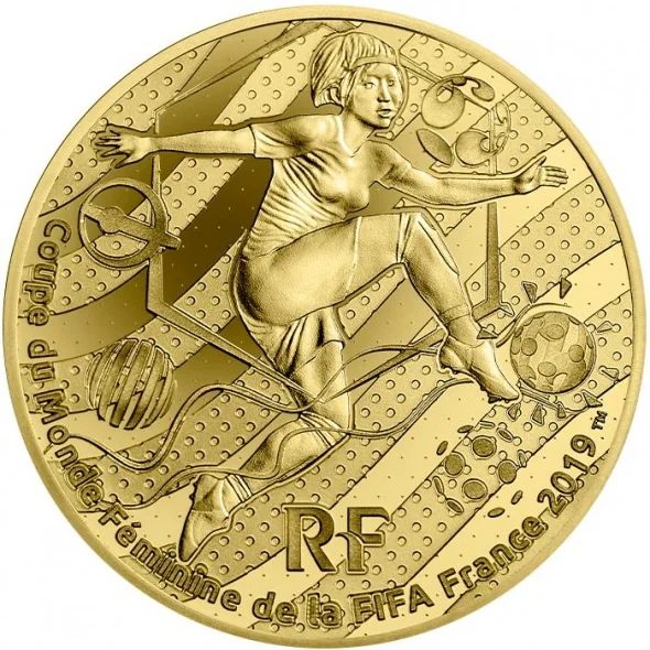 The obverse depicts a player advancing the ball through a hexagon, symbolizing France as host, with the competition's graphic chart in the background.