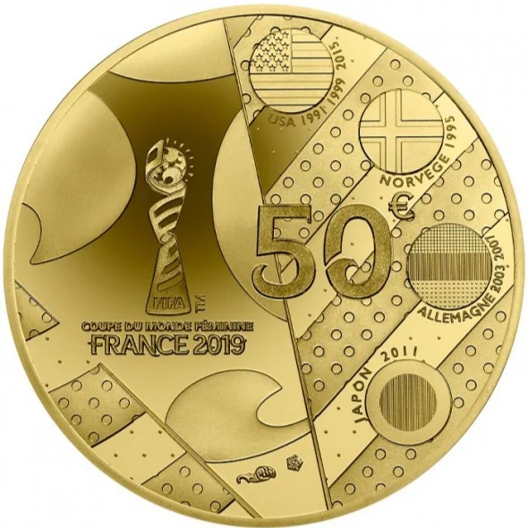 The obverse depicts a player advancing the ball through a hexagon, symbolizing France as host, with the competition's graphic chart in the background.