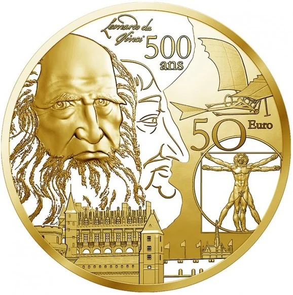 The reverse features Renaissance symbols: François I, Leonardo da Vinci with his Vitruvian Man and flying machine, and the Château d'Amboise, his final resting place.