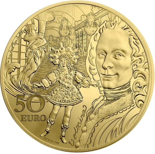 Evokes French Baroque and Rococo through Versailles' Hall of Mirrors, rococo decor, and figures of Voltaire and Louis XIV as the Dancing King.