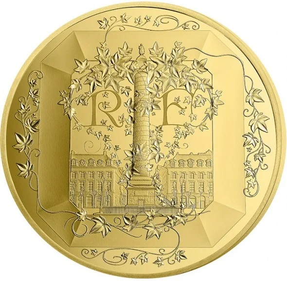 Vendôme Square in an emerald shape features its famous column, climbed by triumphant ivy leaves. The coin's center shows the RF letters encircled by this ivy.