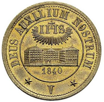 Fribourg Jesuit College encircled, with the radiant "IHS" monogram above. Legends within a grenetis circle. Two stars below.