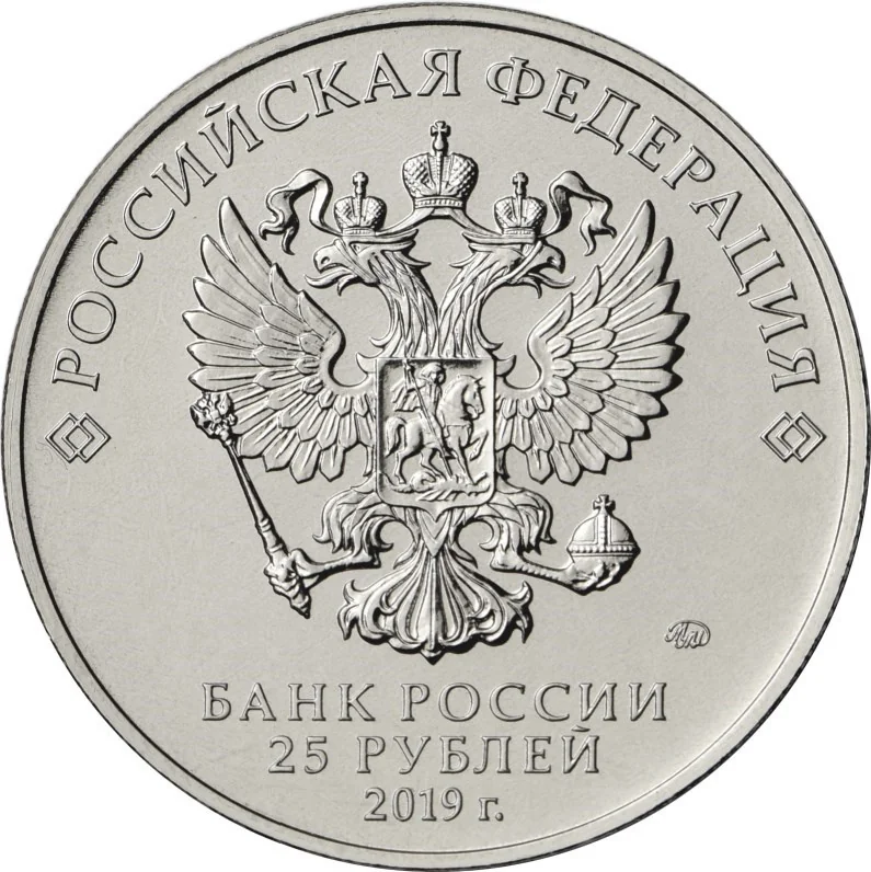 The obverse features the Russian Federation national emblem with "РОССИЙСКАЯ ФЕДЕРАЦИЯ" above, the Moscow Mint mark on the right, and "БАНК РОССИИ", "25 РУБЛЕЙ", and "2019 г." below.