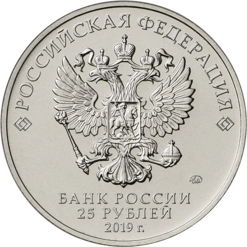 The obverse features the Russian Federation national emblem with "РОССИЙСКАЯ ФЕДЕРАЦИЯ" above, the Moscow Mint mark on the right, and "БАНК РОССИИ", "25 РУБЛЕЙ", and "2019 г." below.