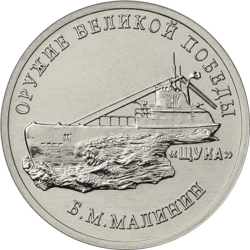 A relief of a Shchuka-class submarine with 'ЩУКА' on the right. Around the edge: 'ОРУЖИЕ ВЕЛИКОЙ ПОБЕДЫ' above and 'Б.М. МАЛИНИН' below.