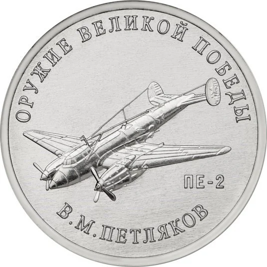 Right: Pe-2 bomber relief with "PE-2" inscription. Top circumference: "WEAPONS OF THE GREAT VICTORY". Bottom: "VLADIMIR PETLYAKOV".