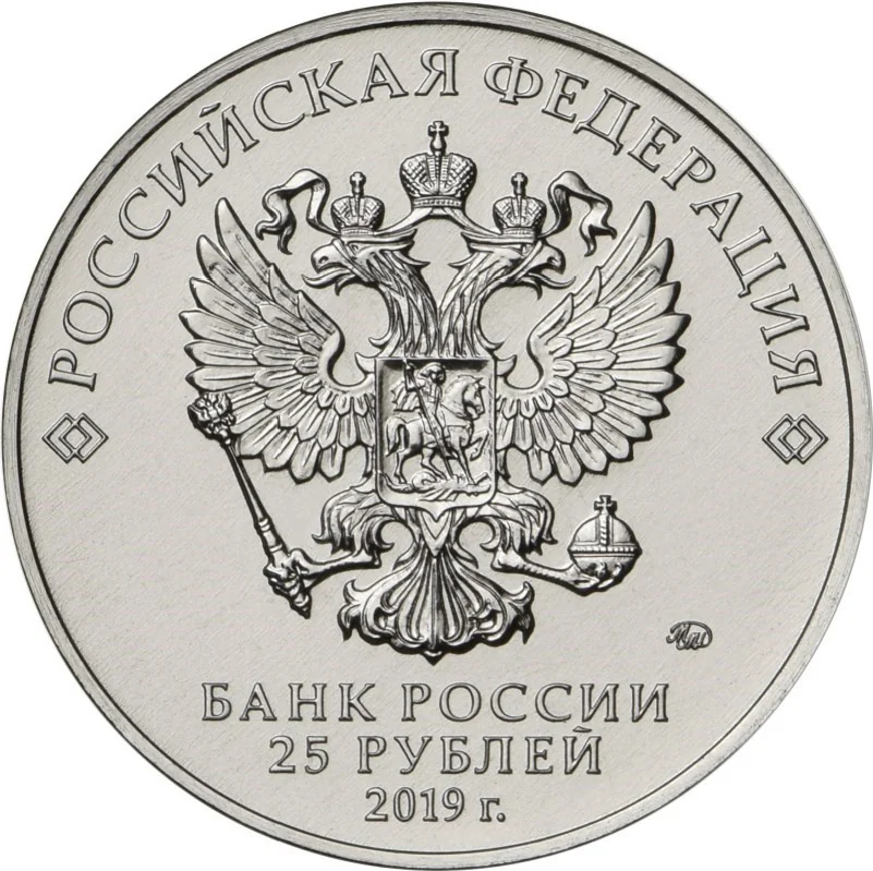 The obverse features the Russian Federation national emblem with "РОССИЙСКАЯ ФЕДЕРАЦИЯ" above, the Moscow Mint mark on the right, and "БАНК РОССИИ", "25 РУБЛЕЙ", and "2019 г." below.